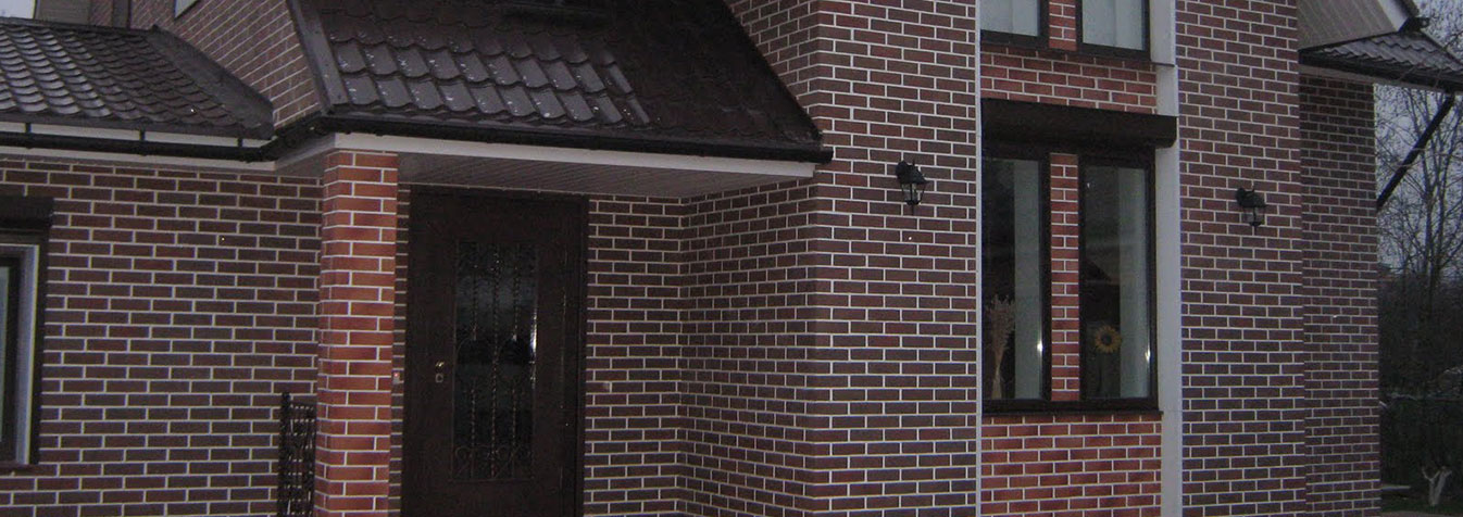 Наружный слой панелей имитирует кладку из клинкерного кирпича. Для облицовки используются настоящие клинкерные плитки, изготовленные из шамотной глины, обожженные при высокой температуре. В отличие от клинкерного кирпича, плитки не имеют объема, они являются плоскими. Кладку выполнять не нужно, плитки надежно приклеены к основанию. Для отделки дома необходимо провести монтаж больших панелей, скрепив их между собой.