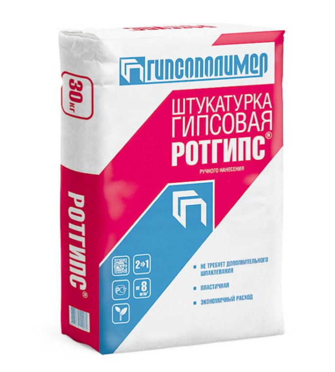 Штукатурка гипсовая Ротгипс используется для базового выравнивания стен и потолков в сухих помещениях. Не требует шпаклевания. Главный компонент строительной смеси — высококачественный гипс, который представляет собой экологически чистый и легкий материал.